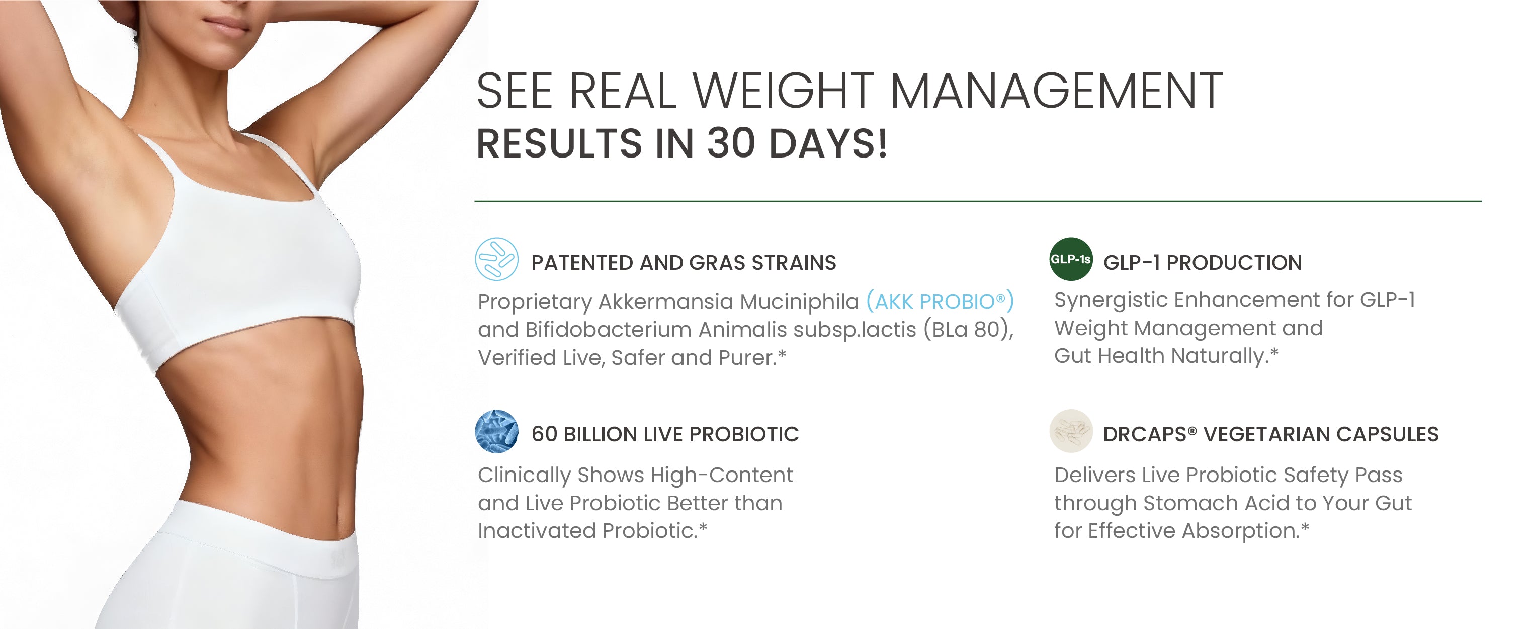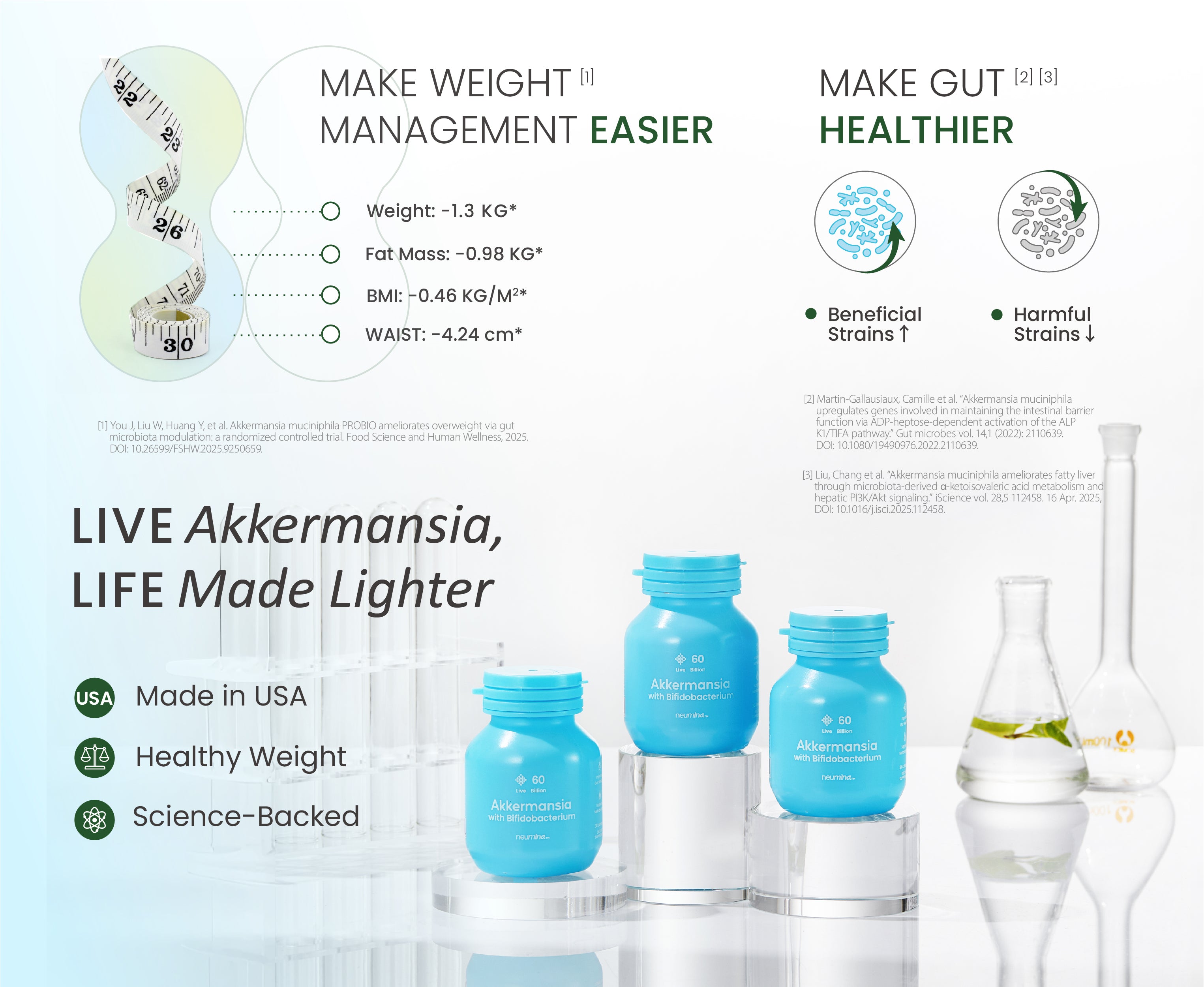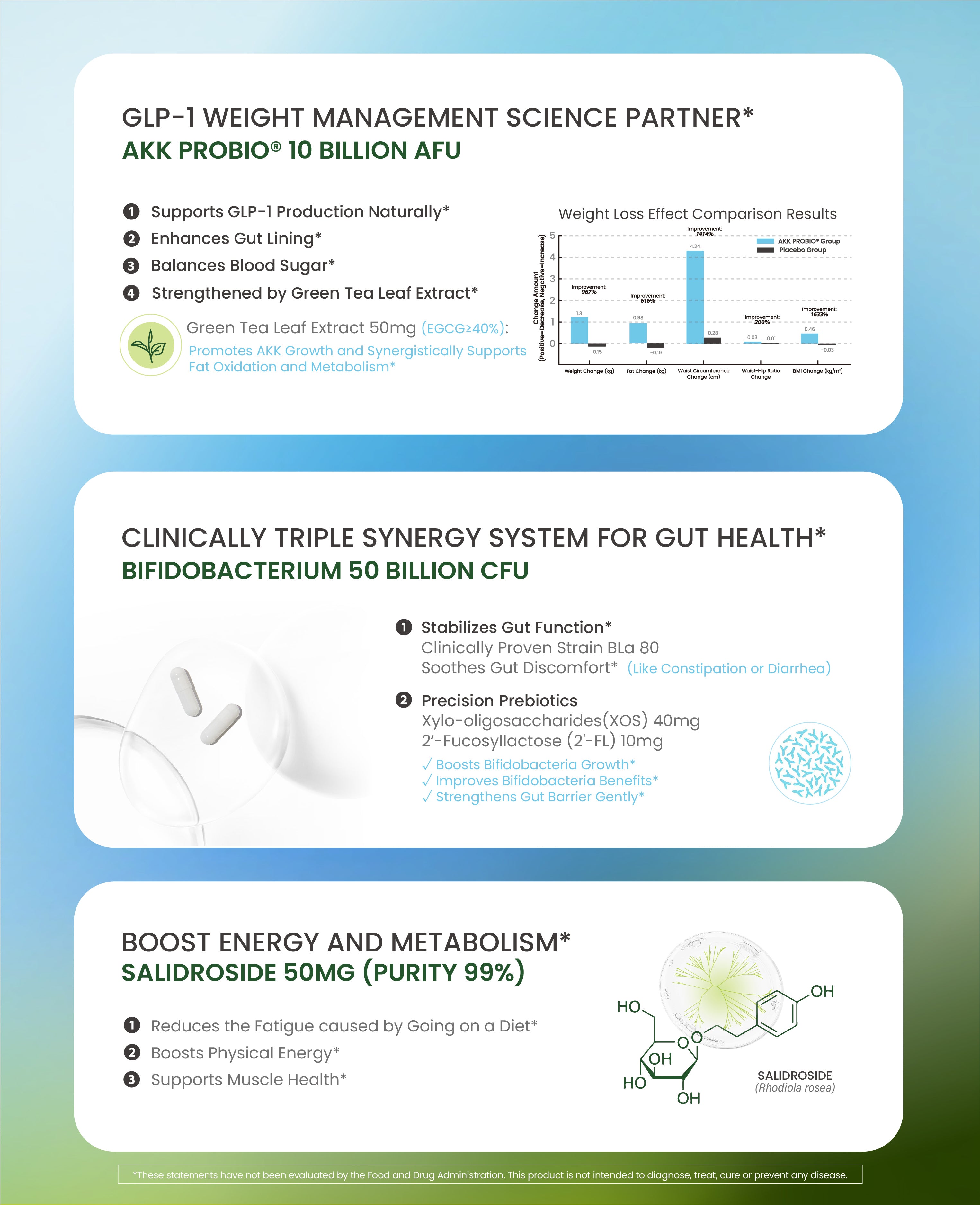 The AKK strain in this formula has been tested in a 130-person human RCT — not borrowed from a loosely related study. The Salidroside is backed by its own RCT for energy and performance. This isn't a formula built on "similar strains" or "related research." It's built on direct evidence.