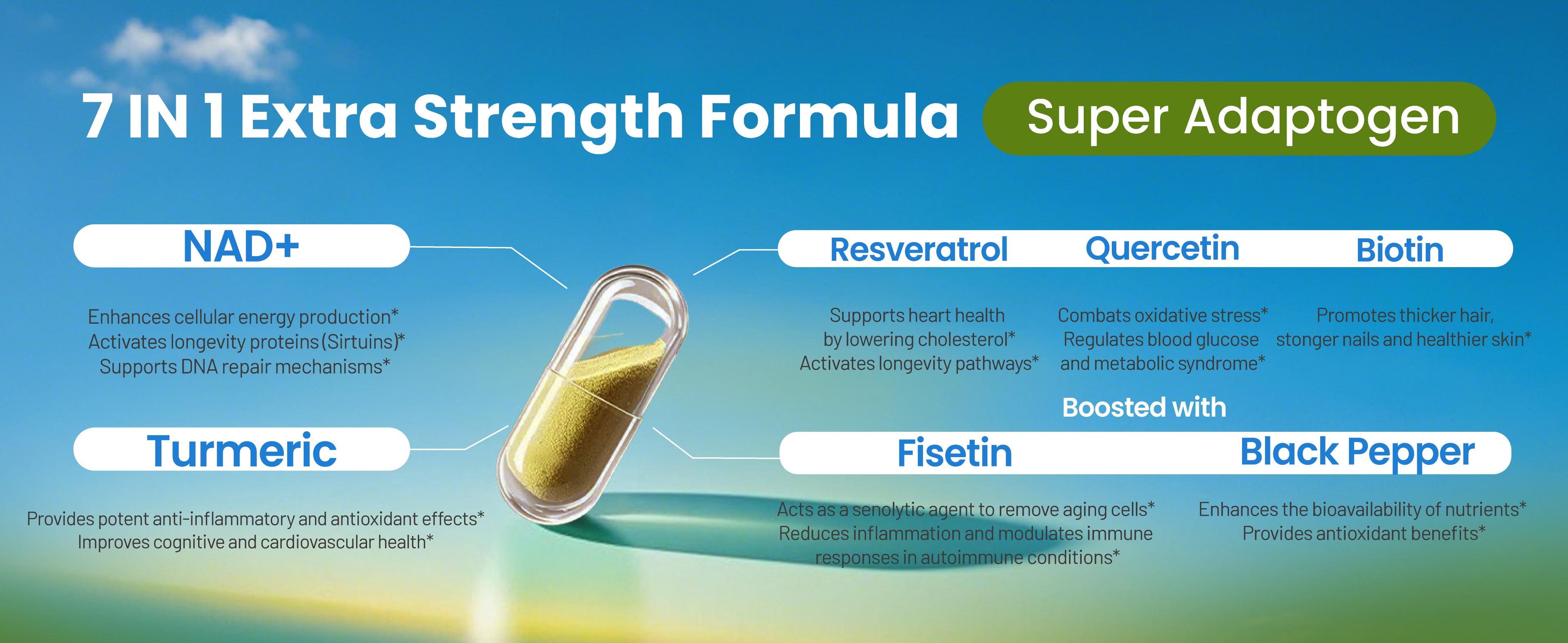 With turmeric, resveratrol, quercetin, biotin, fisetin & black pepper; 7 in 1 formula.